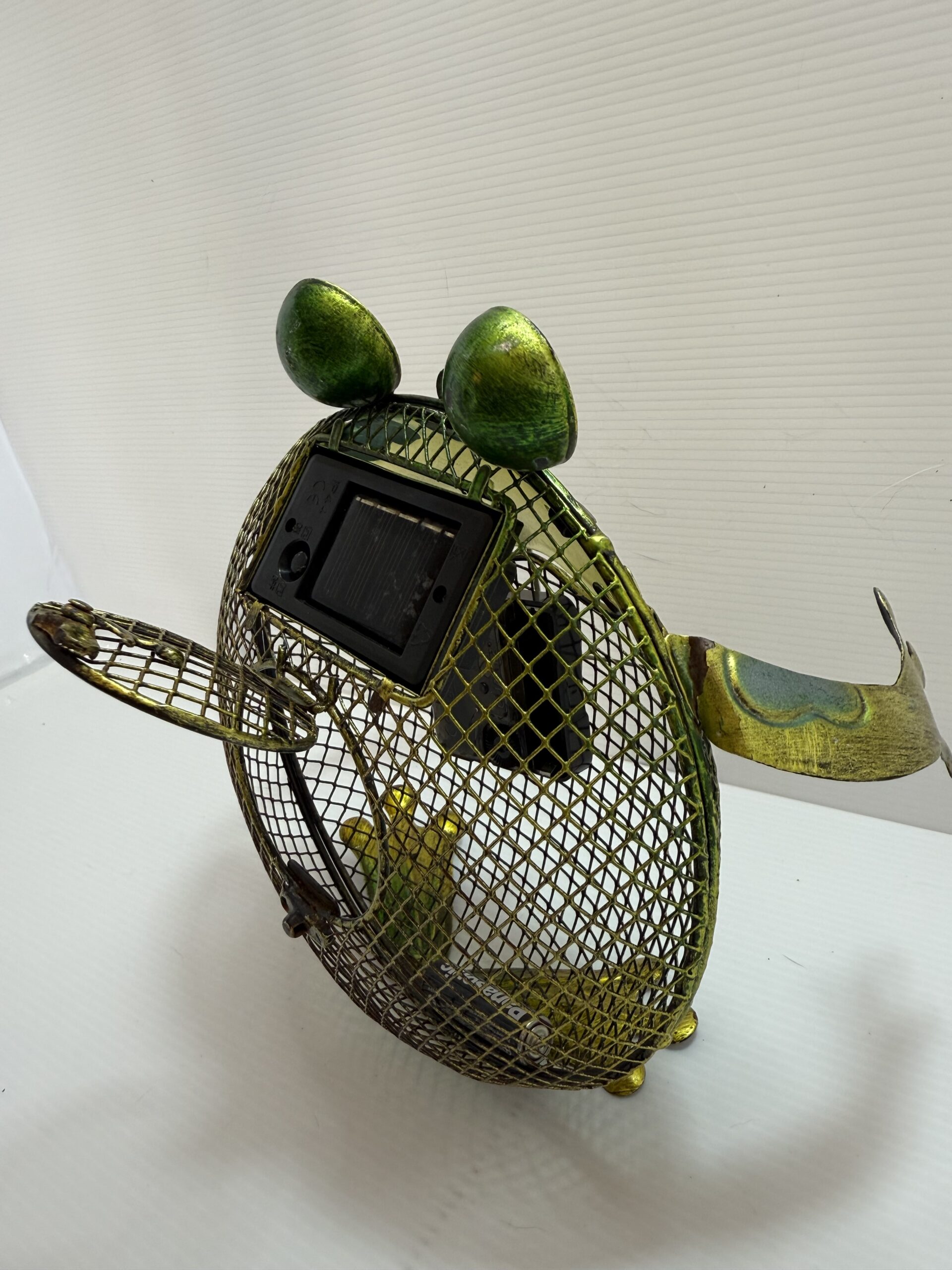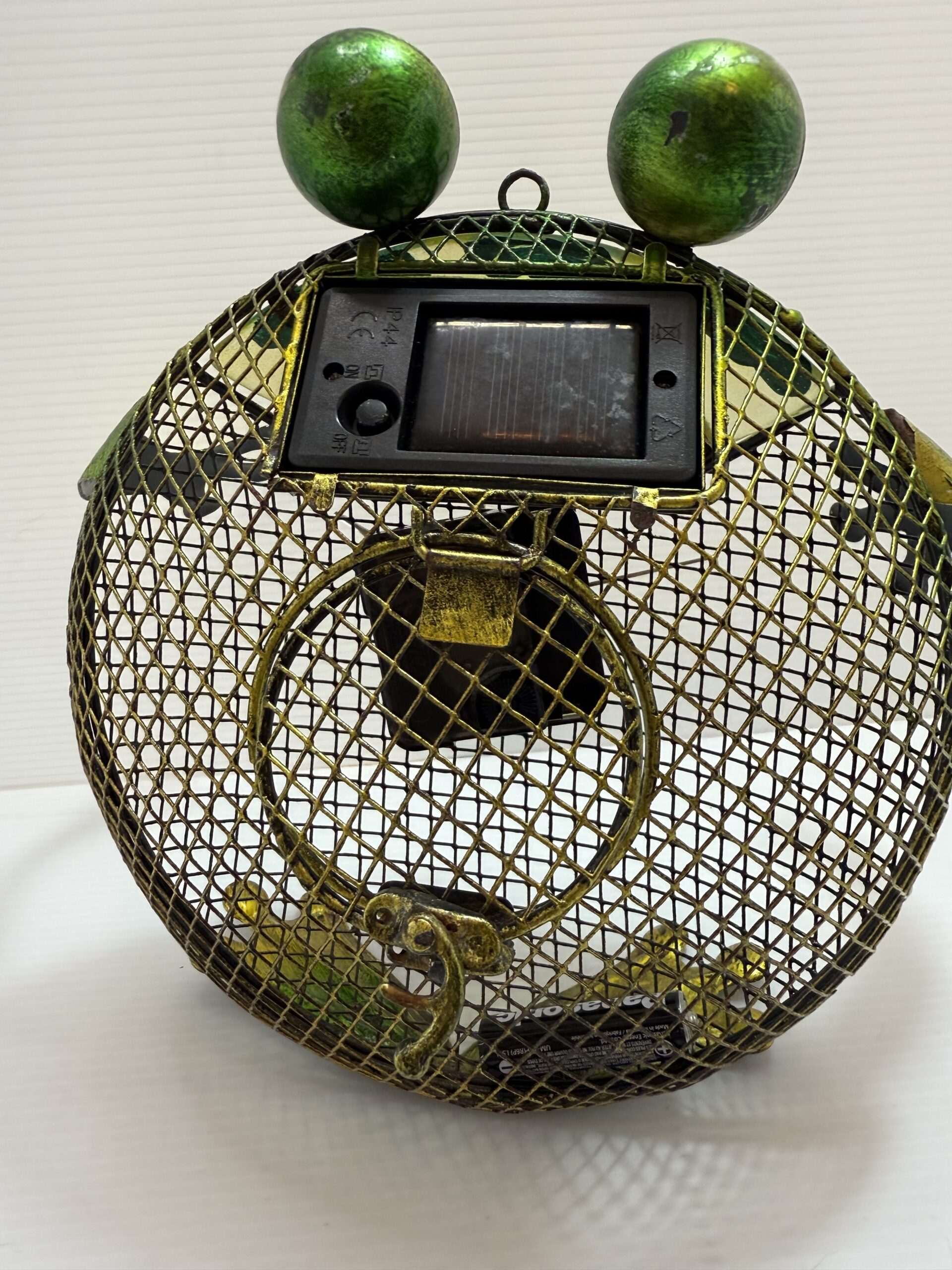 FROG IN A CAGE. He is Approx. 12″ tall X 9″ wide. Made of metal. Frog can stand up or hang him.