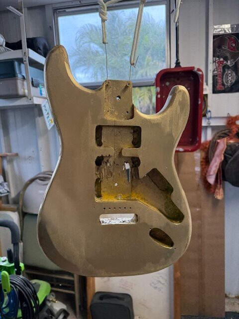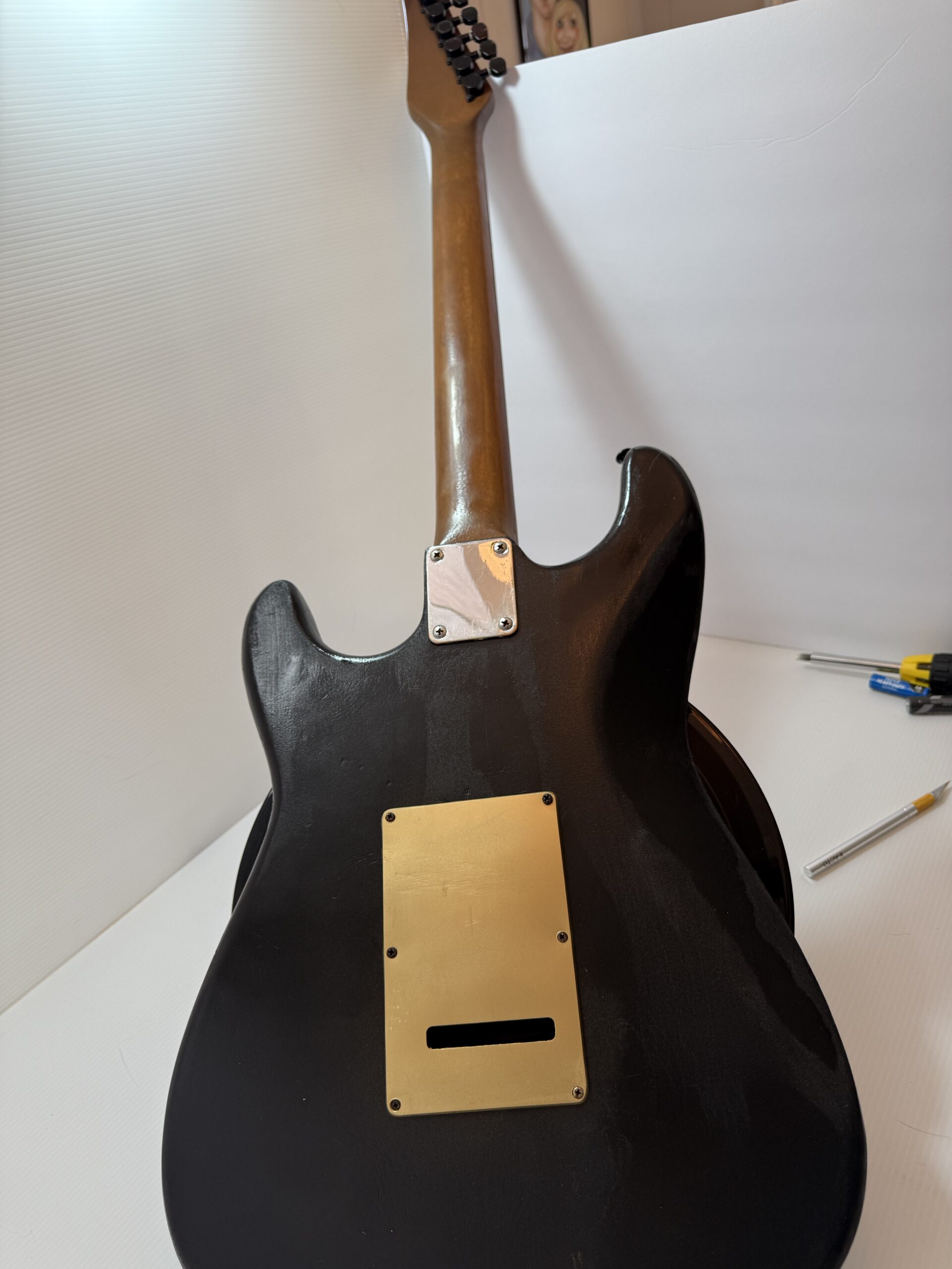 GUITAR STARTED OUT A STRATOCASTER. STRIPPED DOWN TO THE WOOD, COMPLETELY MODIFIED THEN HAND PAINTED.  THIS CUSTOM CLOCK HAS AN HOUR HAND SIMULATED ARM AND STYLIS. THE GUITAR HAS A 33RPM RECORD WITH A CD ROM ON THE CLOCK. CLOCK MOTOR IS POWERED BY ONE AAA BATTERY.  (Remove back Panel to change Battery) GUITAR WALL HANGER INCLUDED.  Floor Guitar stand Available at $20.00