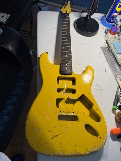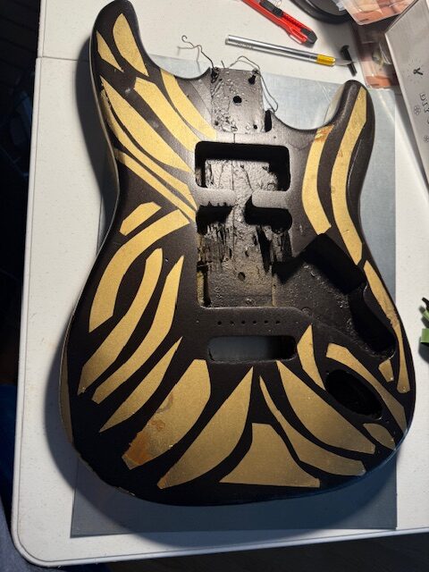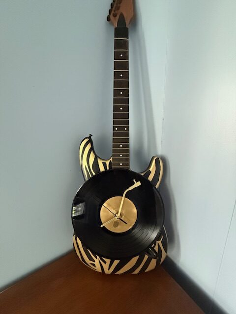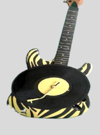 GUITAR WAS STRIPPED DOWN TO THE WOOD THEN COMPLETELY MODIFIED THEN HAND PAINTED. THIS CUSTOM CLOCK HAS AN HOUR HAND SIMULATED ARM AND STYLIS. THE GUITAR HAS A 33RPM RECORD WITH A CD ROM ON THE CLOCK.