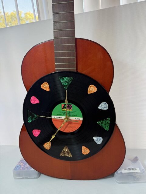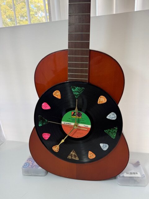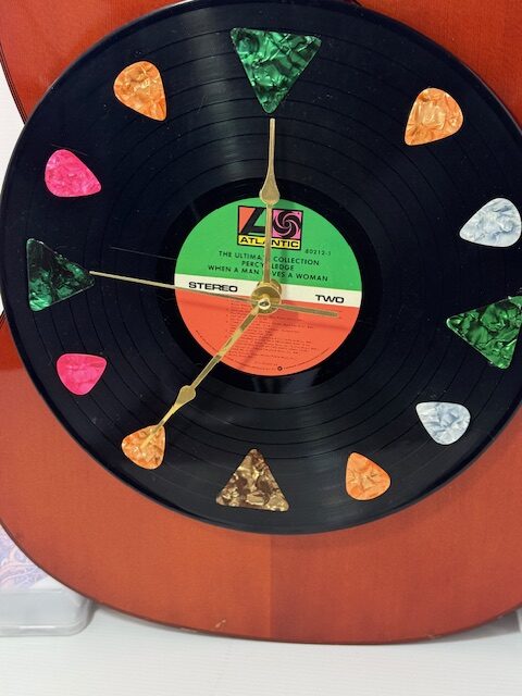 BEAUTIFUL RED ACOUSTIC GUITAR. THE PICS MOUNTED ON THE 33 rpm RECORD ACTS AS THE CLOCK NUMBERS. FULL SIZE GUITAR 14-1/2″ W X 41″ TALL. A GUITAR WALL MOUNT IS INCLUDED. GREAT GUITAR – NO STRINGS. RECORD (CLOCK) must be removed to replace the Battery. Original Paint