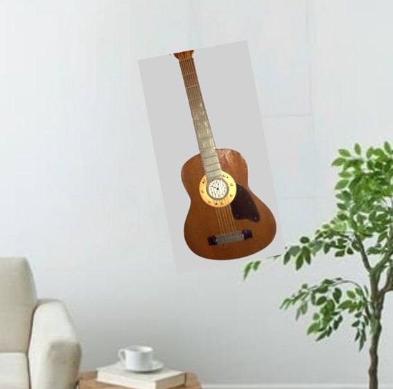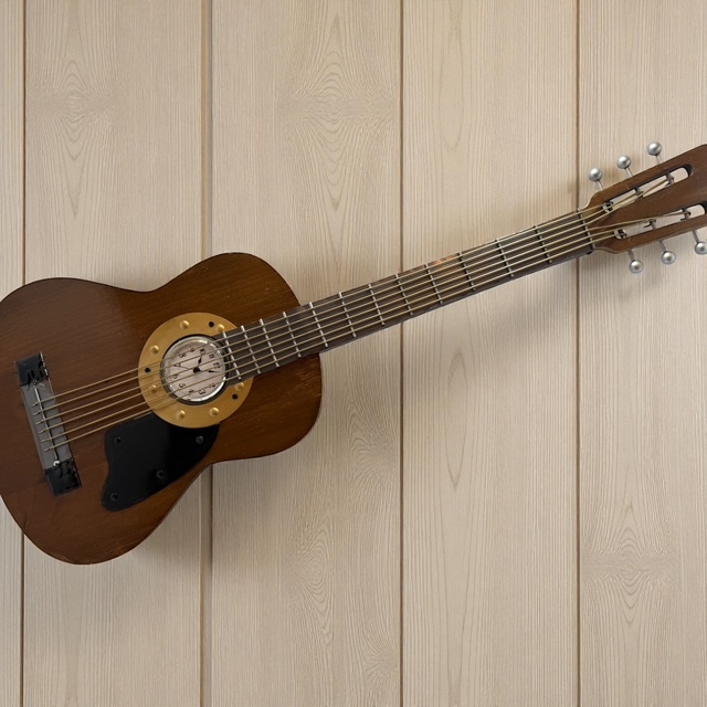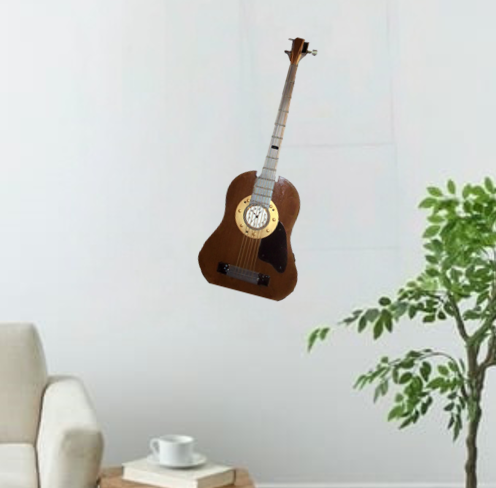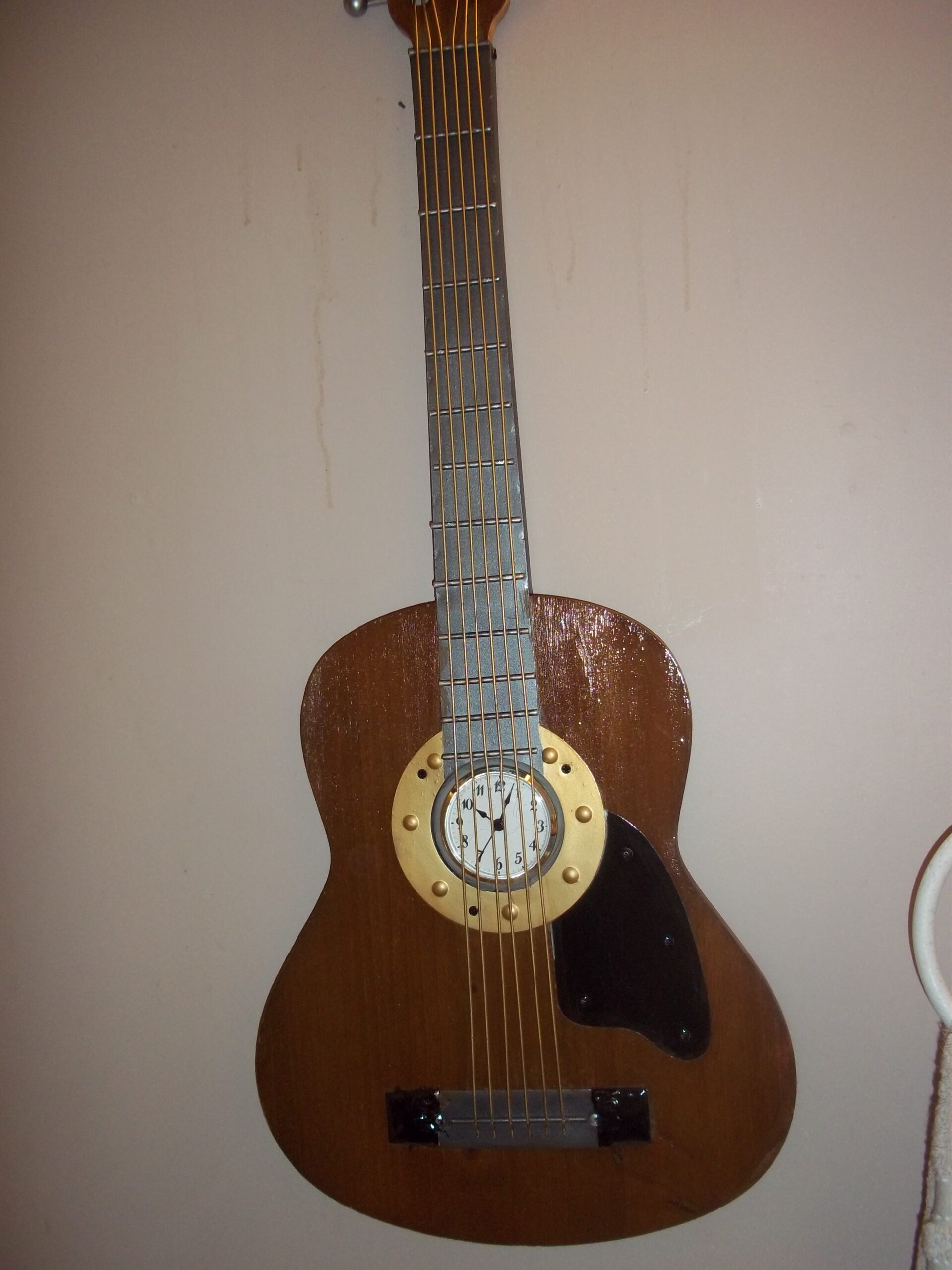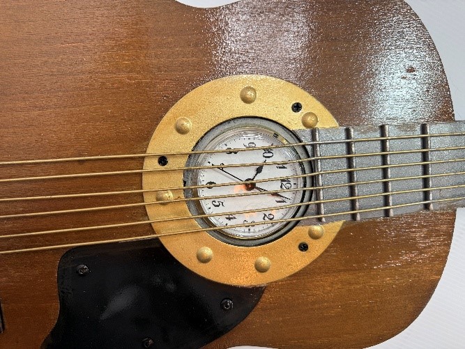 THE ROUND 4” ANALOG CLOCK IS MOUNTED IN THE CENTER OF THE GUITAR. 36-1/2″ x 14″