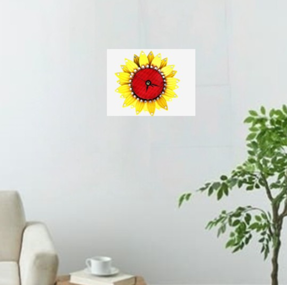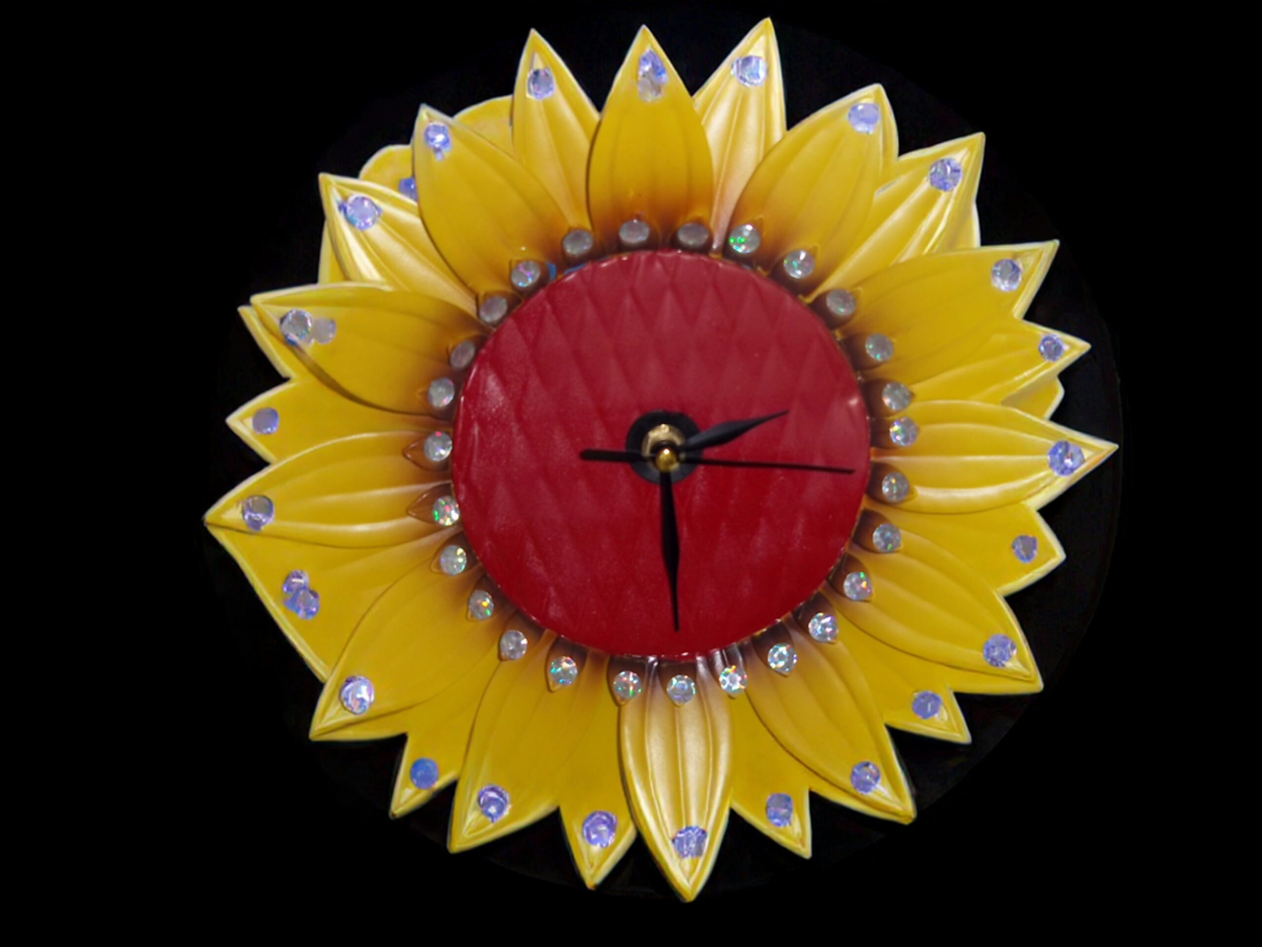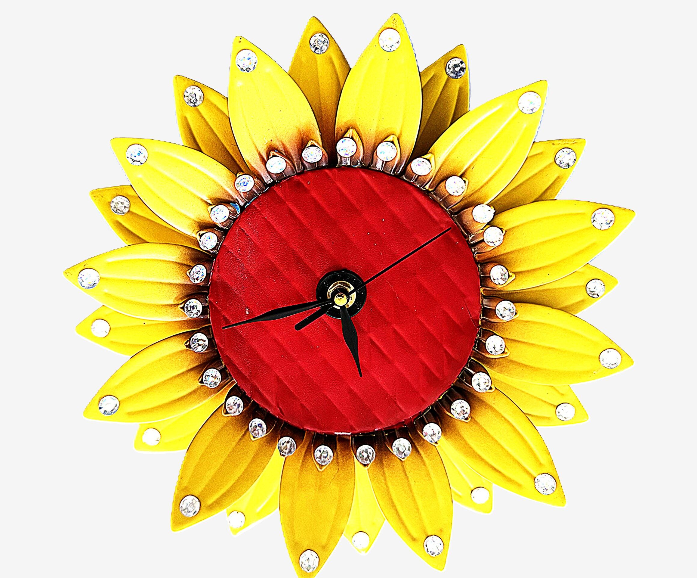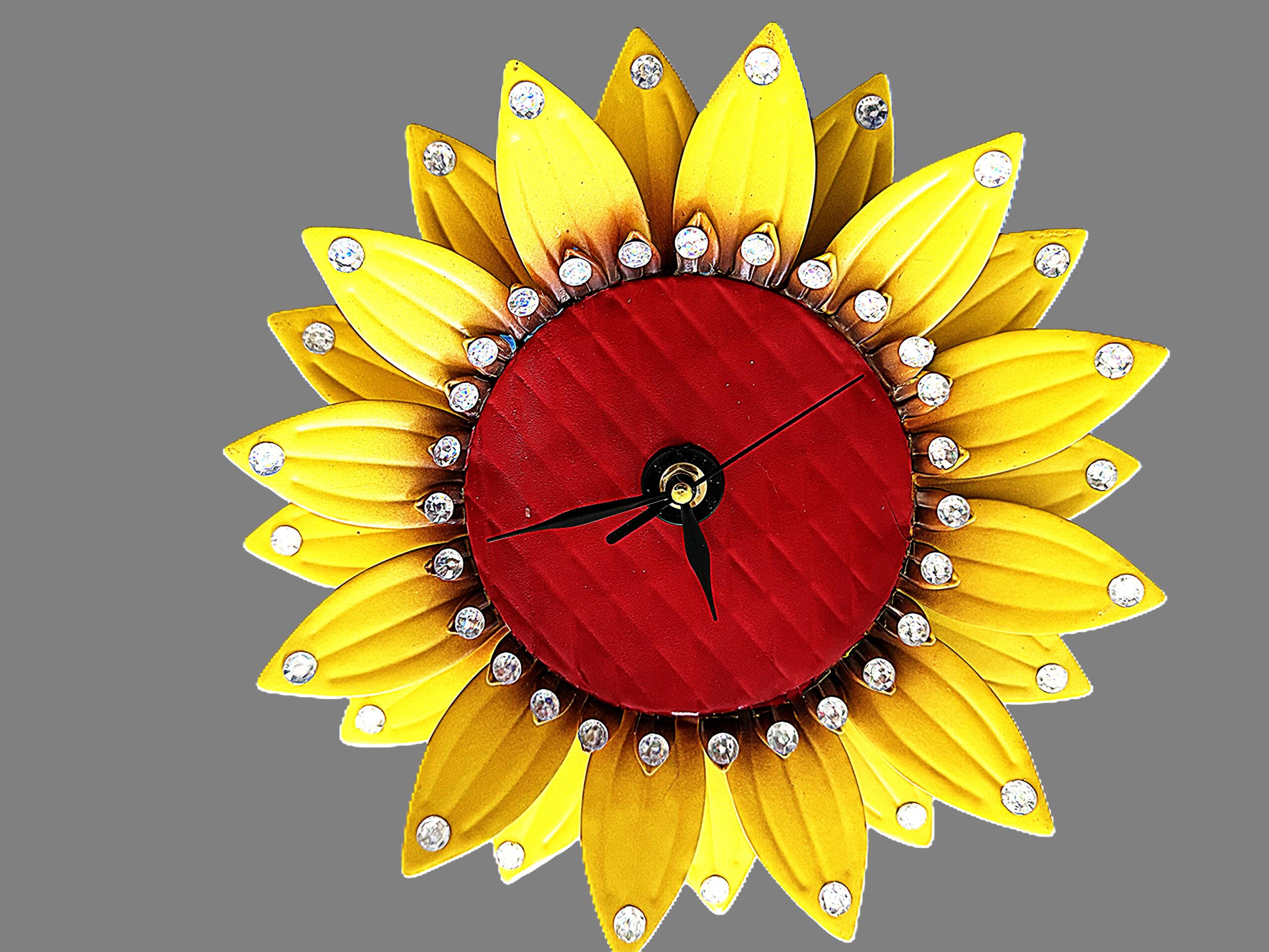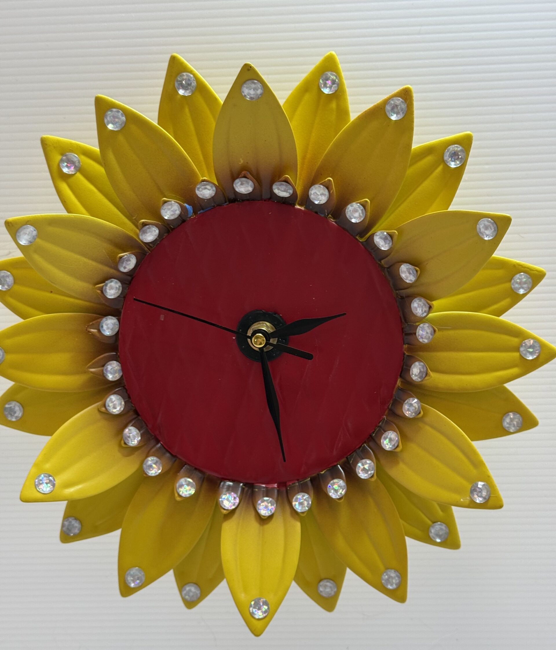 METAL FLOWER WITH PEDALS PAINTED YELLOW. THE INSIDE IS PAINTED RED with BLING